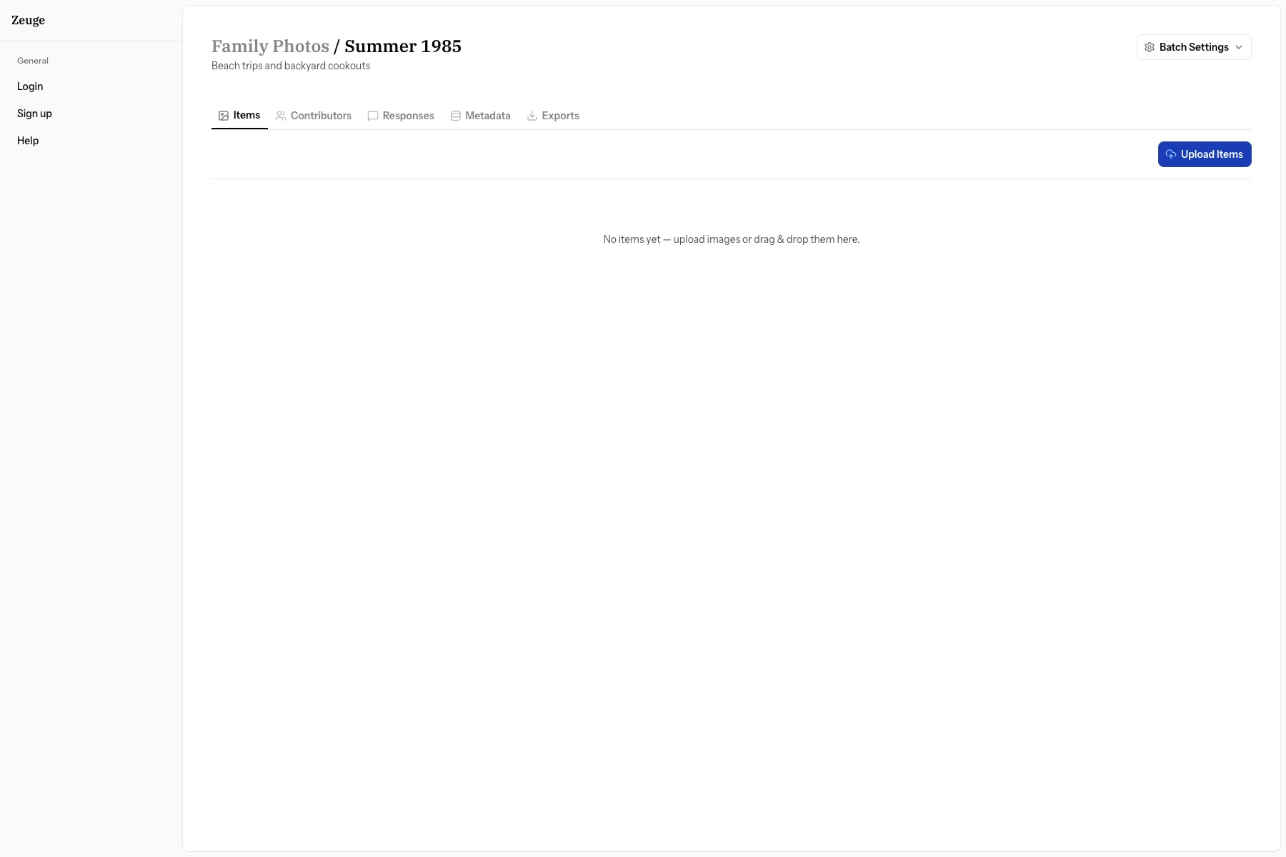 In Zeuge, your content is organized in a two-level hierarchy: Archives contain Batches, and Batches contain Items (photos, documents, etc.). This guide walks you through creating both.
