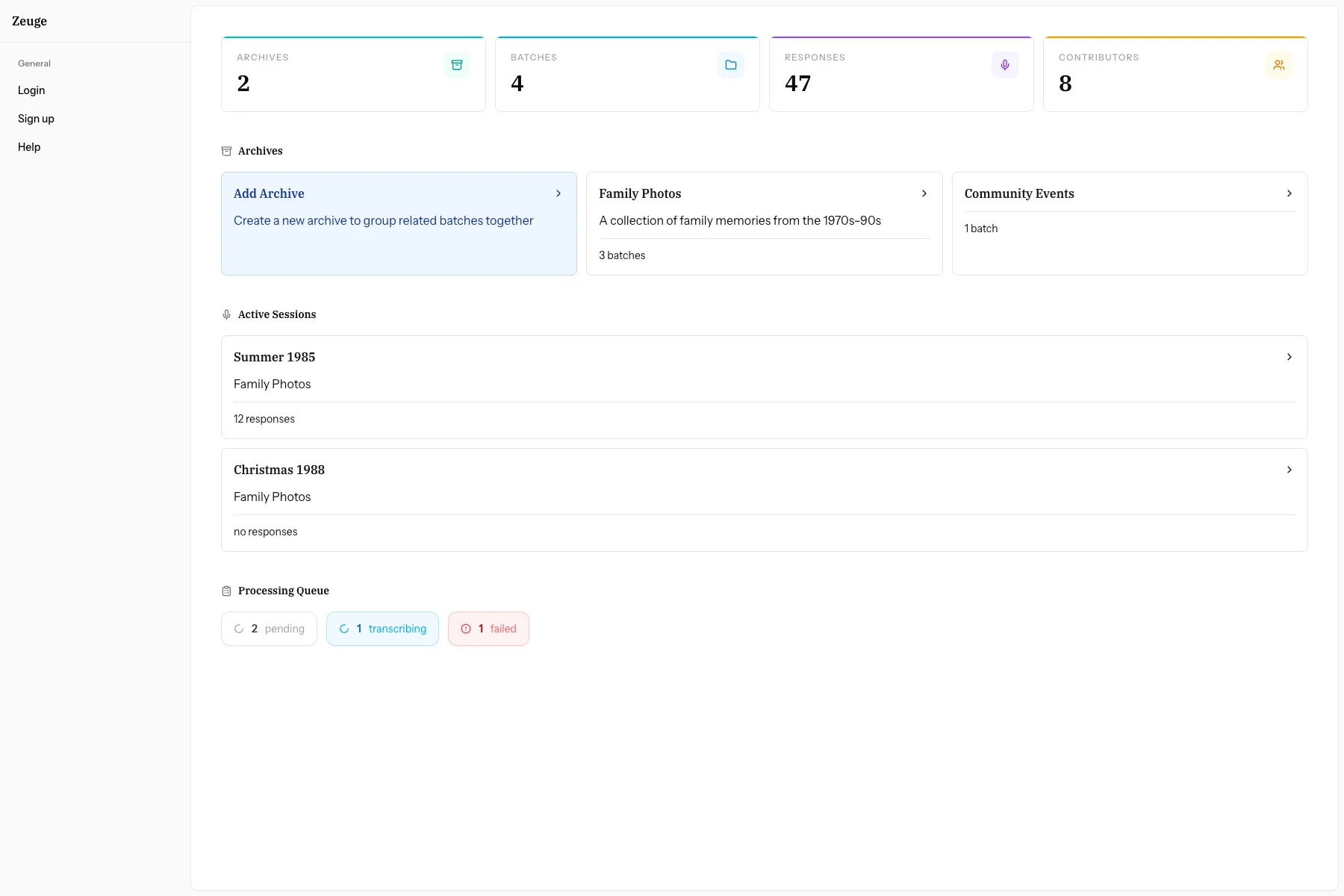 After signing in, you'll land on the Dashboard — an overview of your archives, active batches, and any responses being processed.