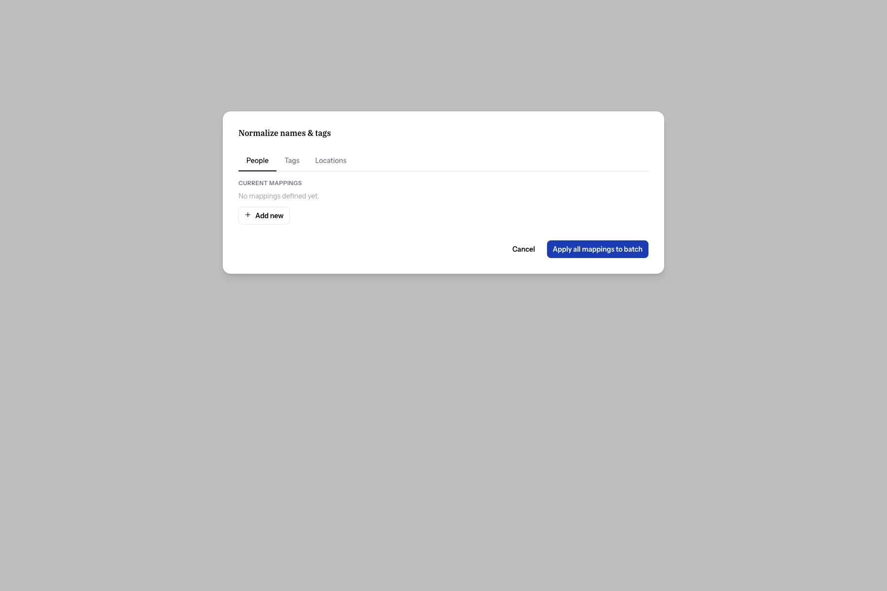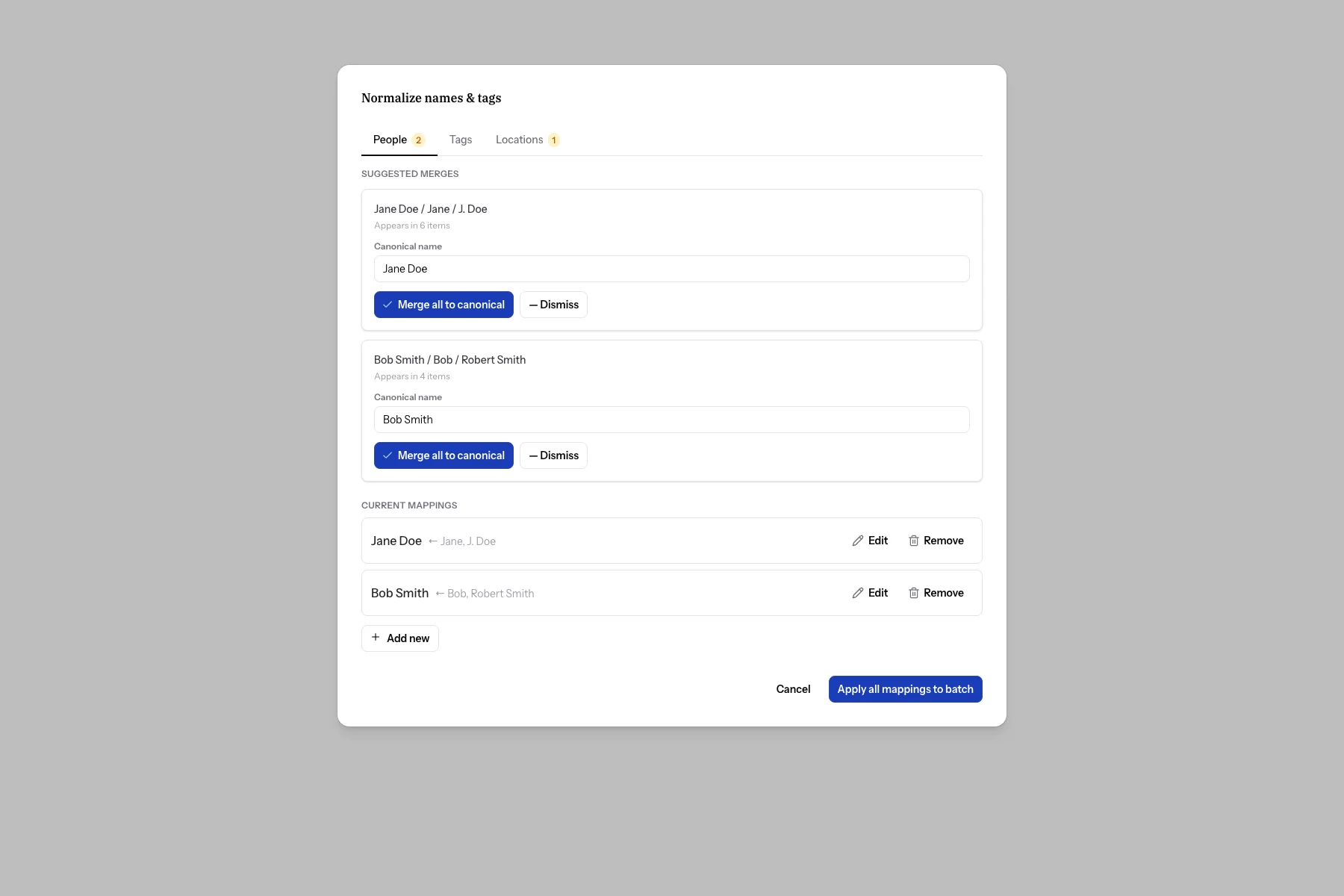 When multiple contributors describe the same photos, they naturally use different phrasings for the same people, places, and tags. One person says "Bob," another says "Uncle Bob," and a third says "Robert Johnson." Entity normalization lets you tell Zeuge that all three refer to the same person, so your archive uses a consistent, canonical name.