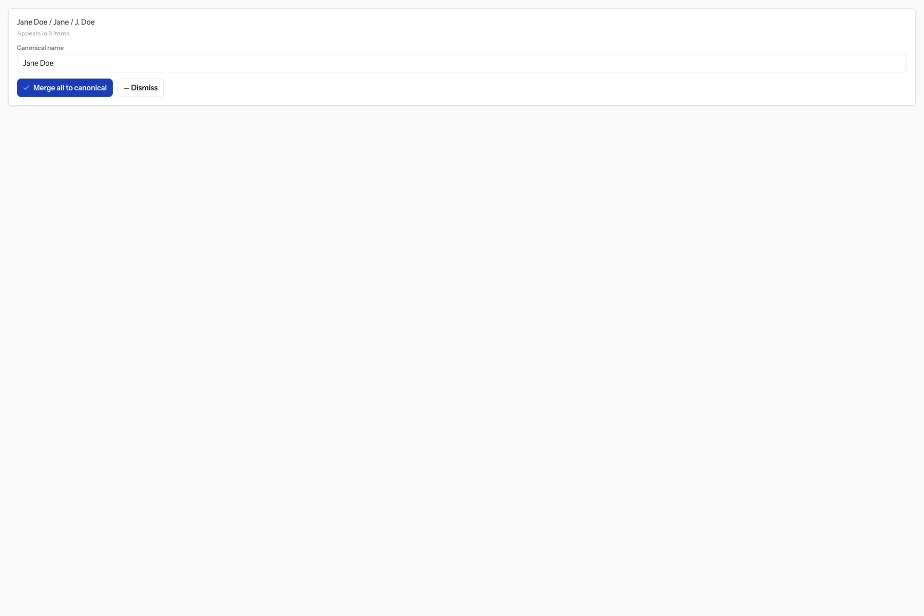 📸 [SCREENSHOT: A single suggestion card showing the "Merge," "Skip," and the custom canonical name input]