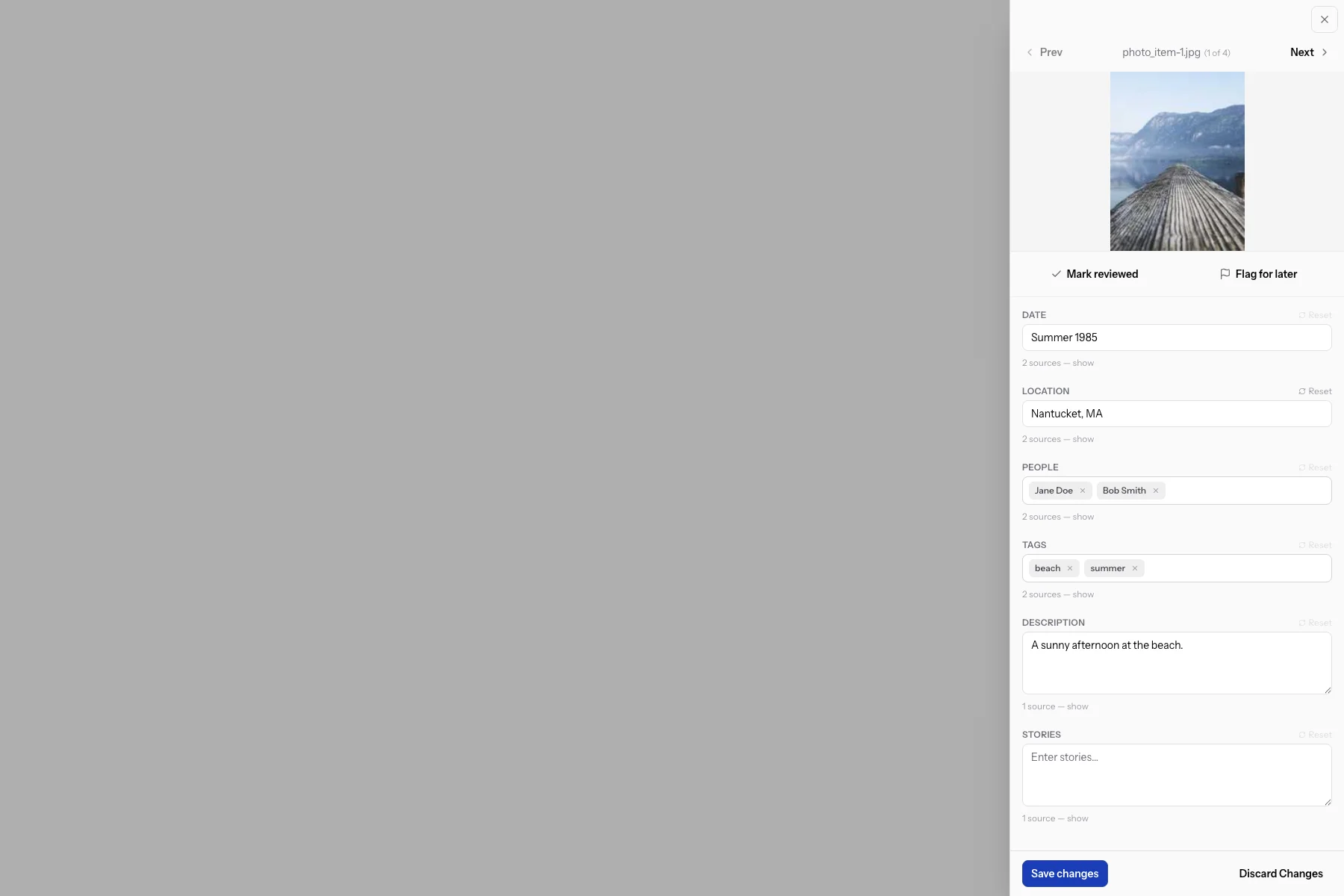 📸 [SCREENSHOT: The Item Editor Panel open — showing date, location, people, tags, description, and stories fields with their source badges]