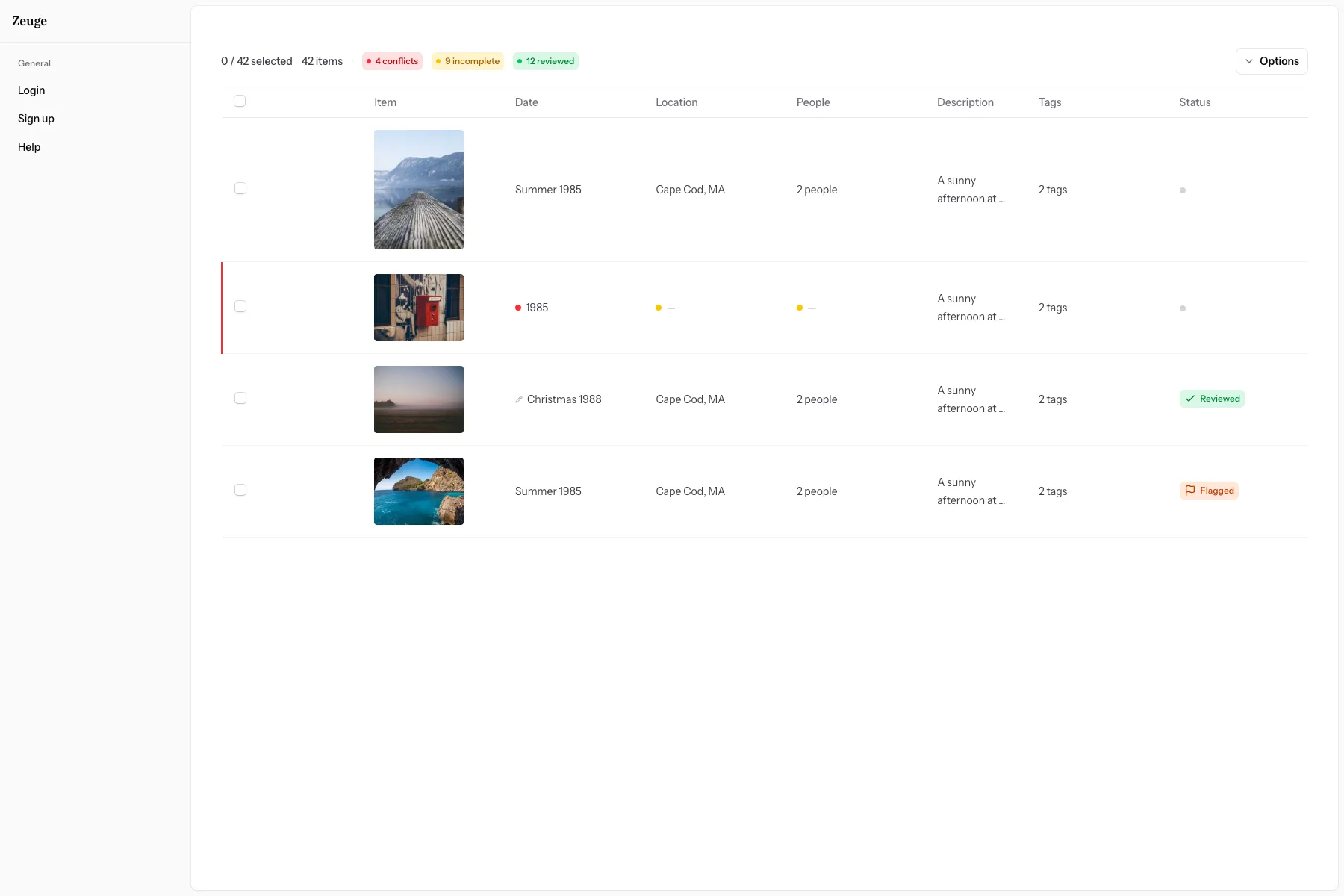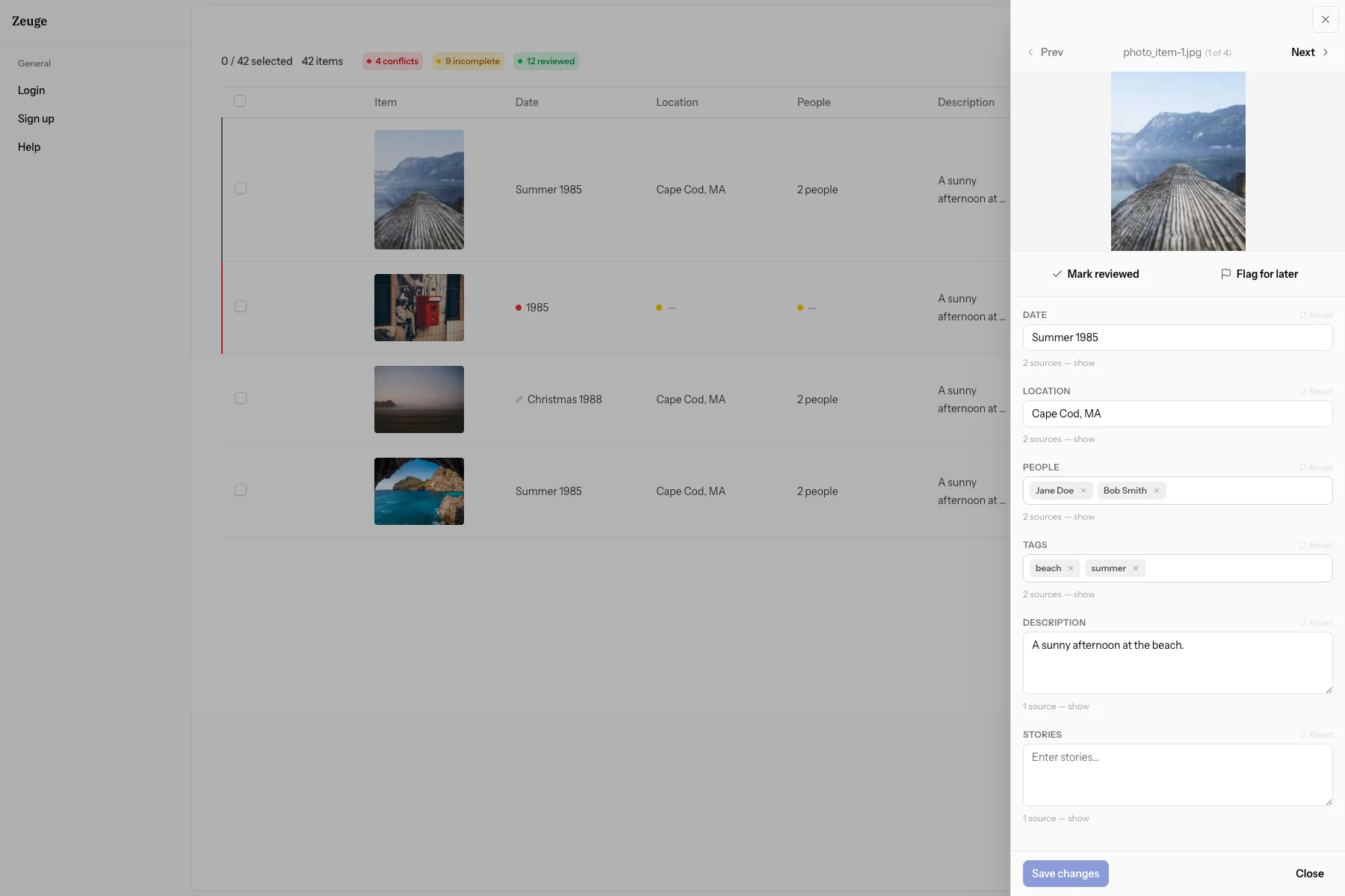 If two or more contributors gave different values for the same field (e.g., one says "1985" and another says "1987"), Zeuge flags the item with a conflict indicator and shows the detail in the editor panel.
